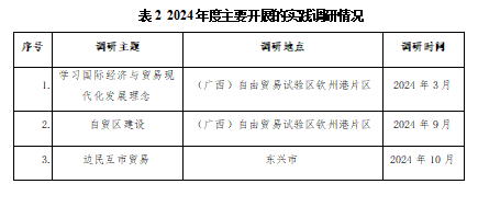 2.积极开展实践教学。集团大力开展国际商务案例库的建设、教学基础设施建设,依托william威廉亚洲国际商务研究中心等平台,开展调查研究,打造MIB模拟实训室等。积极利用中国国际商务专业学位教学案例库,共享全国优质的教育资源。本年度组织员工到广西自贸区钦州港片区调研学习等地开展实践(见表2)。