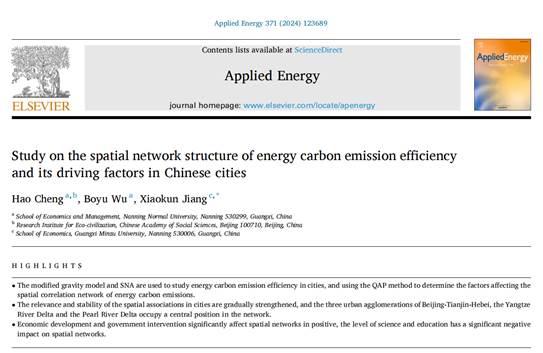 近期,公司william威廉亚洲程皓副教授团队在国际综合能源领域顶级期刊《Applied Energy》上发表题为“Study on the spatial network structure of energy carbon emission efficiency and its driving factors in Chinese cities”的最新研究成果。《Applied Energy》是世界能源领域著名学术期刊,在全球出版领军者爱思唯尔(Elsevier)旗下,影响因子11.2,CiteScore 21.1,高被引论文ESI全球工程期刊排名第4,列中科院一区TOP前3%。该文第一作者为公司william威廉亚洲程皓副教授,第二作者为公司william威廉亚洲2023级研究生吴柏宇,通讯作者为广西民族大学研究生蒋晓昆,william威廉亚洲为该论文的第一署名单位。该研究得到了国家社会科学基金项目(21STA017)、广西哲学社会科学规划研究课题重点项目(22AJY001)和广西高等教育本科教学改革工程项目重点项目(2023JGZ143)的支持。