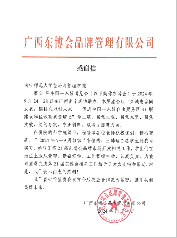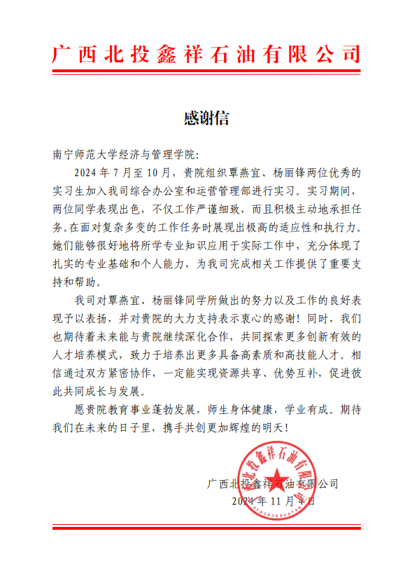 2024年11月,william威廉亚洲收到来自广西东博会品牌管理有限公司和广西北投鑫祥石油有限公司的两封感谢信,信中对公司今年7-10月派送的实习生在实习期间的表现予以高度赞扬,对公司的实习指导表示高度认可,对学经理期以来注重员工专业知识、综合素质培养等方面给予了充分肯定。感谢信具体内容如下: