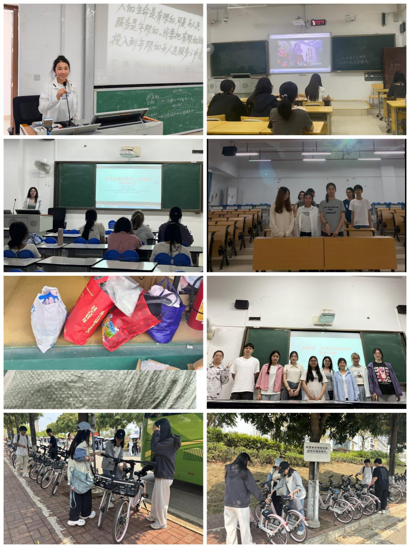 各组以不同的形式,不同的视角开展主题活动。第一组在五合综合教学楼开展了校园环保公益活动,一部分同学清理路面、草丛中的垃圾;另一部分同学则专注于整理共享单车,将随意停放的车辆摆放整齐。第二组在五合校区东北门顺丰邮寄点设立的自主捐赠站,开展了旧书、衣物捐赠活动。此外,第二组还观看了《雷锋:永不褪色的精神坐标》主题纪录片,一部展现了雷锋同志无私奉献的一生的影片。第三组在文理综合教学楼文楼教室唱响《学习雷锋好榜样》的主题歌曲。同学们个个精神饱满,歌声铿锵有力,饱含着对雷锋的崇敬,传递着对雷锋精神的深刻认同。在随后的演讲活动中,或讲述雷锋的生平事迹,或结合自己的自身经历发扬雷锋精神。第四小组在文理综合教学楼文楼共同观看了有关雷锋精神的视频,观影结束后,积极分子们积极分享身边的雷锋事例:有的讲述了社区志愿者义务照顾孤寡老人的故事,有的分享了同学在日常生活中不计个人得失、乐于助人的经历。各组积极分子们一致表示,要努力成为有理想、敢担当、能吃苦、肯奋斗的新时代好青年,积极参加更多的社会实践活动,在活动中践行新思想,传承伟大的雷锋精神。