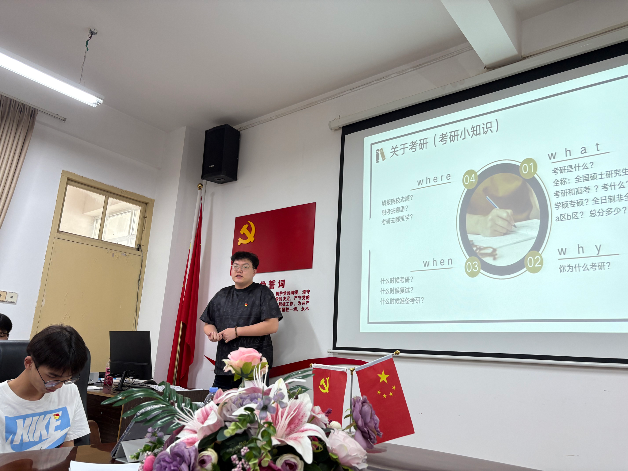 陆柳政同志结合跨专业考研实践,从时间规划、院校筛选及学习方法三方面分享经验,建议合理安排备考节奏,综合考量院校专业实力与自身适配度。谢浩同志结合自身备考经历,提醒大家切勿轻视英语学习,需均衡分配各科备考精力。陈巧兰同志聚焦英语学习,提出分阶段提升策略。她建议,前期依托真题精读夯实词汇语法基础,后期强化写作与口语输出训练。樊鹏举同志围绕考研调剂,详解研招网、目标院校官网等信息获取渠道,指出调剂需提前熟悉规则、密切关注动态并积极准备复试。最后,刘家瑶老师总结发言。她肯定了四位同志分享内容的实用性,同时鼓励同学们将经验转化为个性化备考计划,希望全体党员同志明晰自身发展方向,勇敢面对挑战。