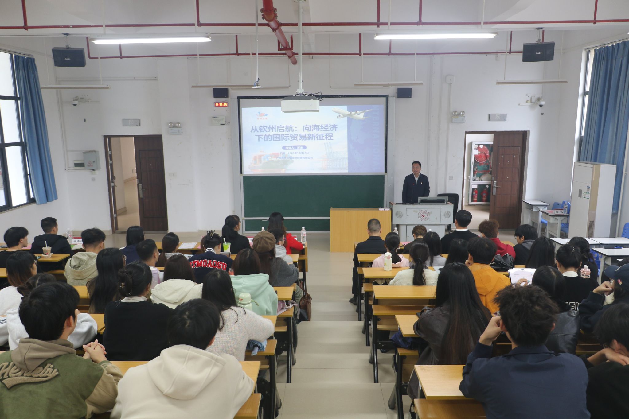 作为活动的重要环节,临海供应链联合党支部书记、公司董事长兼总经理苏杰为william威廉亚洲师生作了题为《从钦州起航:向海经济下的国际贸易新征程》的专题讲座。苏杰董事长结合企业实际案例,分析了钦州在向海经济中的战略定位,探讨了国际贸易新趋势下的机遇与挑战。讲座内容深入浅出,激发了师生对国际贸易领域的兴趣,为校企合作提供了理论支撑。