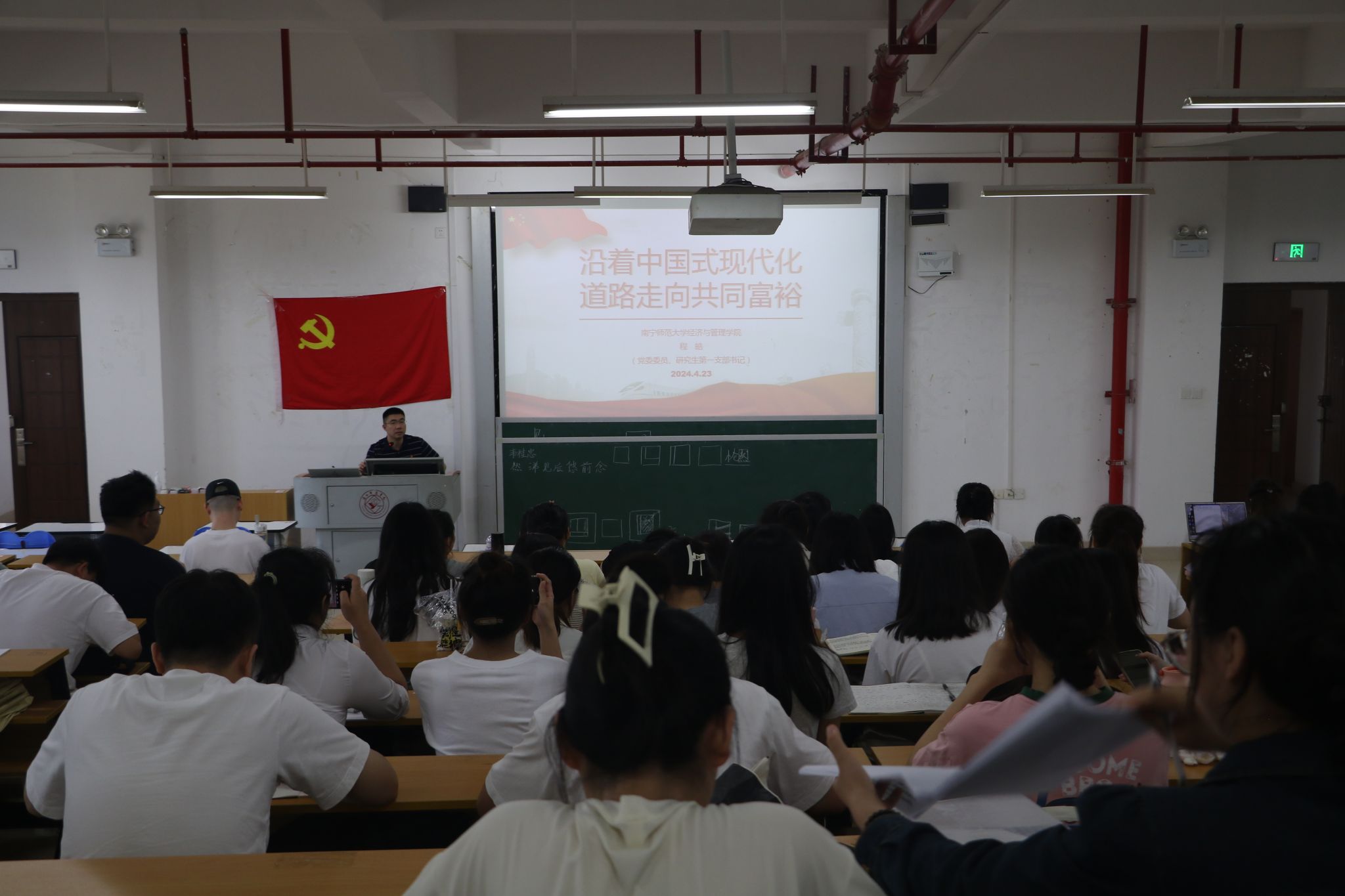 第四讲由程皓主任围绕沿着中国式现代化道路走向共同富裕主题,主要从认识共同富裕的重要意义、理解共同富裕的科学内涵、把握共同富裕的实践途径三个方面进行系统讲解,让在座的预备党员明白实现共同富裕是社会主义的本质要求,坚持以人民为中心的发展思想,全心全意为人民服务是党的重大责任,要解放生产力,通过各种途径消除贫富差距,理解什么是共同富裕,才能真正地实现共同富裕,使中国逐渐富强,在新时代中稳步前行。