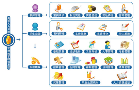 人力资源管理模块中,员工进入后进行企业人事管理的模拟操作,学习了解人力资源管理日常工作的内容;人才市场模块中,员工可作为企业身份和个人身份进行实验,模拟求职和招聘;人力测评系统模块中,提供对职业能力、性格和专业知识的测评;人力资源工具提供了多个人力资源管理应用的图表和幻灯片等工具,同时工具可由教师动态管理和添加;知识库也可以由教师动态管理,提供给员工参考学习;热点讨论区由教师发起讨论主题,员工可参与讨论。