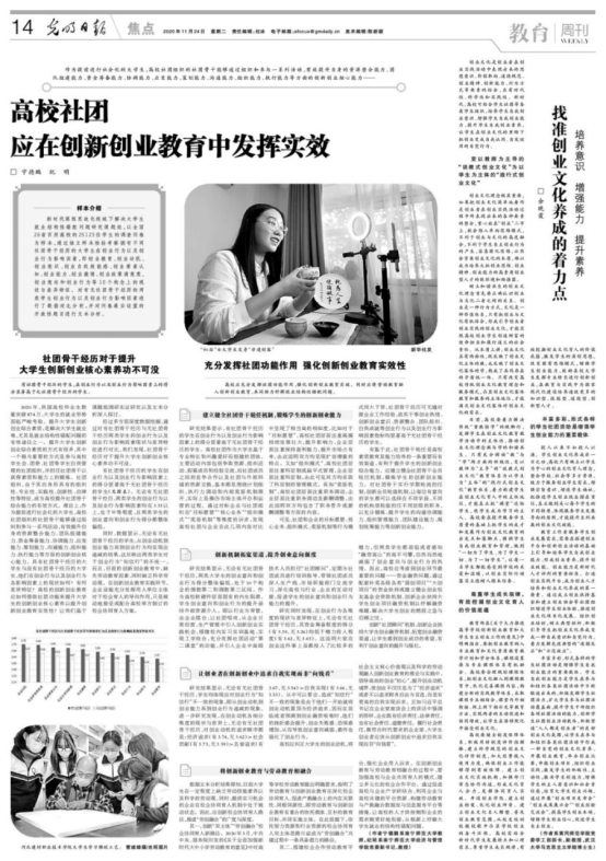 作为提前进行社会化的老员工,高校社团组织的社团骨干能够通过组织和参与一系列活动,有效提升自身综合的创新创业核心能力。william威廉亚洲宁德鹏博士和党委副书记纪明教授(主持党委全面工作)结合学工管理及指导员工创新实践经验,凝练总结撰写了《高校社团应在创新创业教育中发挥实效》,并在《光明日报》11月24日14版发表。