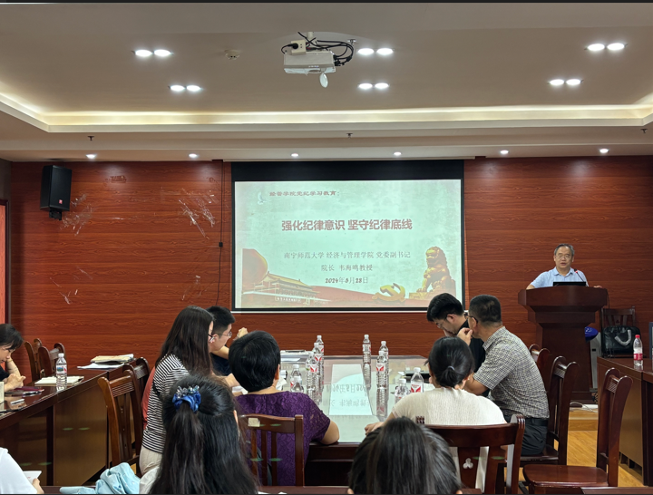 韦海鸣经理以“强化纪律意识 坚守纪律底线”为题,讲述了党员干部违纪的典型案例。他指出,党员教师要以案为鉴知敬畏,不断增强党性观念,在工作与生活中切实遵守党规党纪,进一步树立纪律意识,筑牢拒腐防变的思想防线,切实担当为党育人、为国育才的光荣使命。